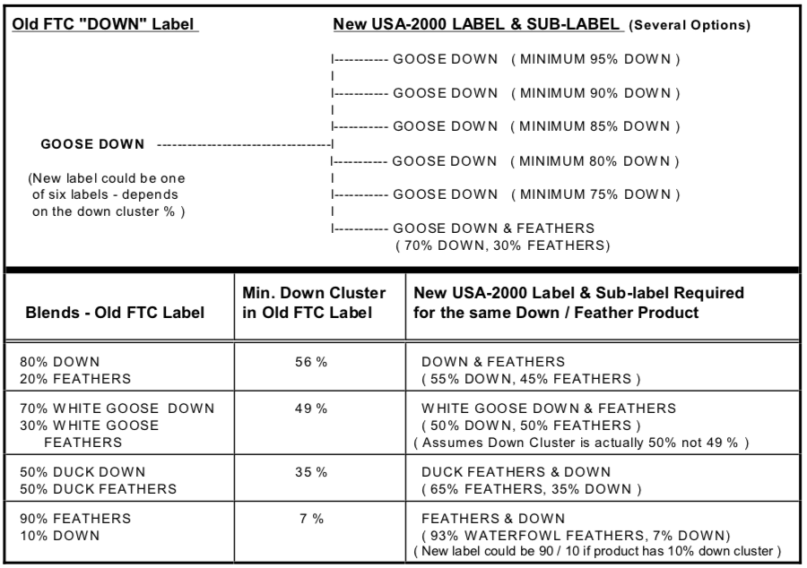 In the old FTC guidelines, "DOWN" was defined to contain at least 70% down clusters, plus allowances for down fiber and other components. The new USA-2000 Standard requires labeling of minimum down cluster ("DOWN"). Other components, such as down fibers, landfowl, residue etc., are included in the "FEATHER" portion of the new label.