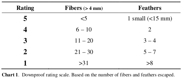 The numerical rating (see Chart 1) is based upon the amount of fibers, down, and/or feathers that escaped or are protruding through the fabric after the 30 minute tumbling period. Note: only fibers > 4 mm are counted.