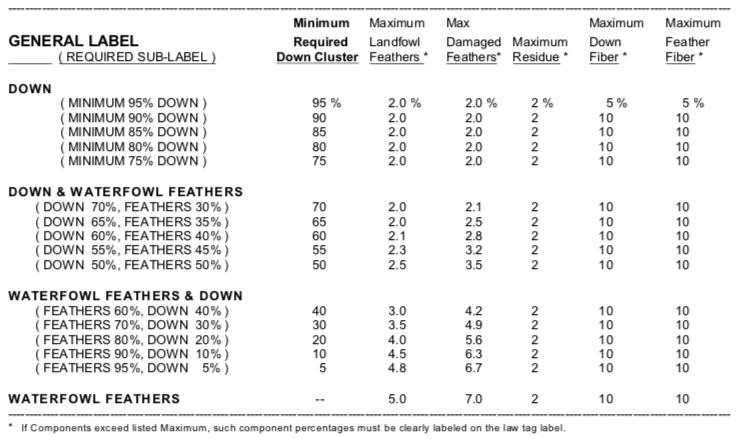 Down/Feather Blends The minimum down cluster content of blended products must be labeled. No tolerance is allowed.