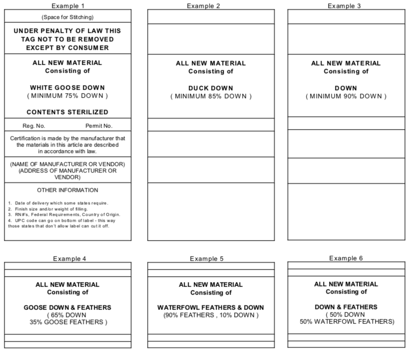 Jackets and vests must declare the actual down content, but do not need the additional label information. Labels for apparel can be smaller in size, but they must accessible to the consumer. This label should contain the general product category and the detailed sub-labeling percentage information, such as DOWN (MINIMUM 80% DOWN).